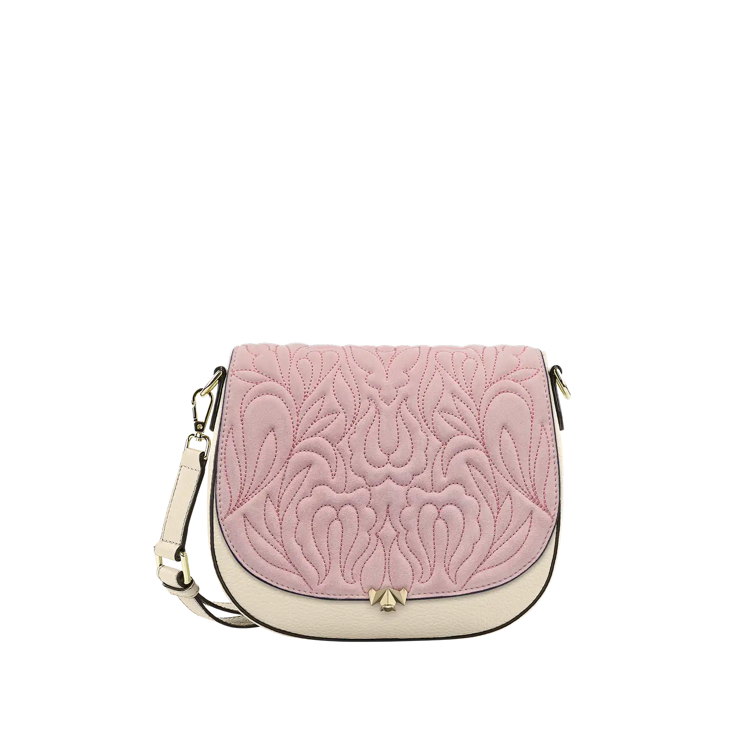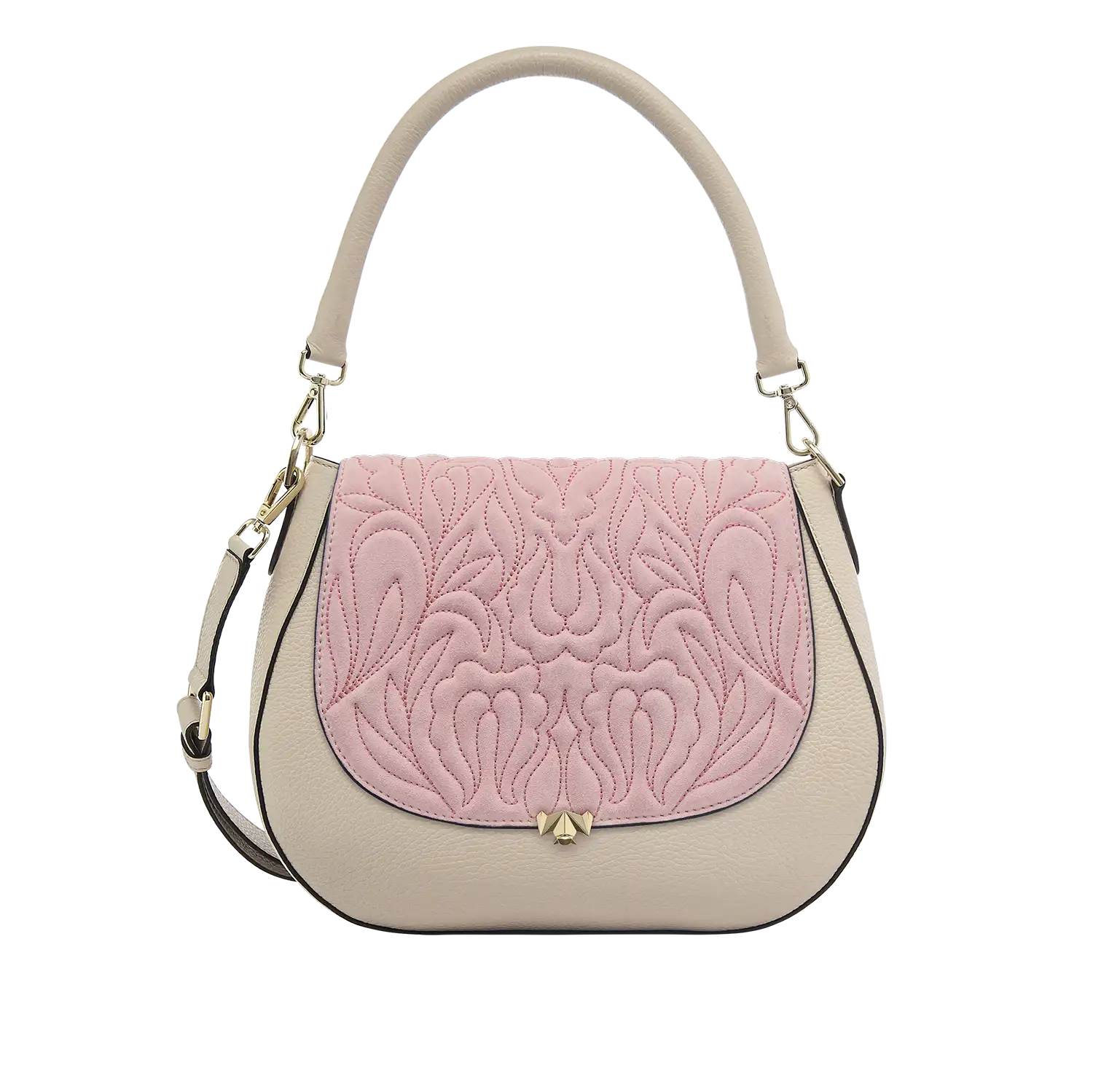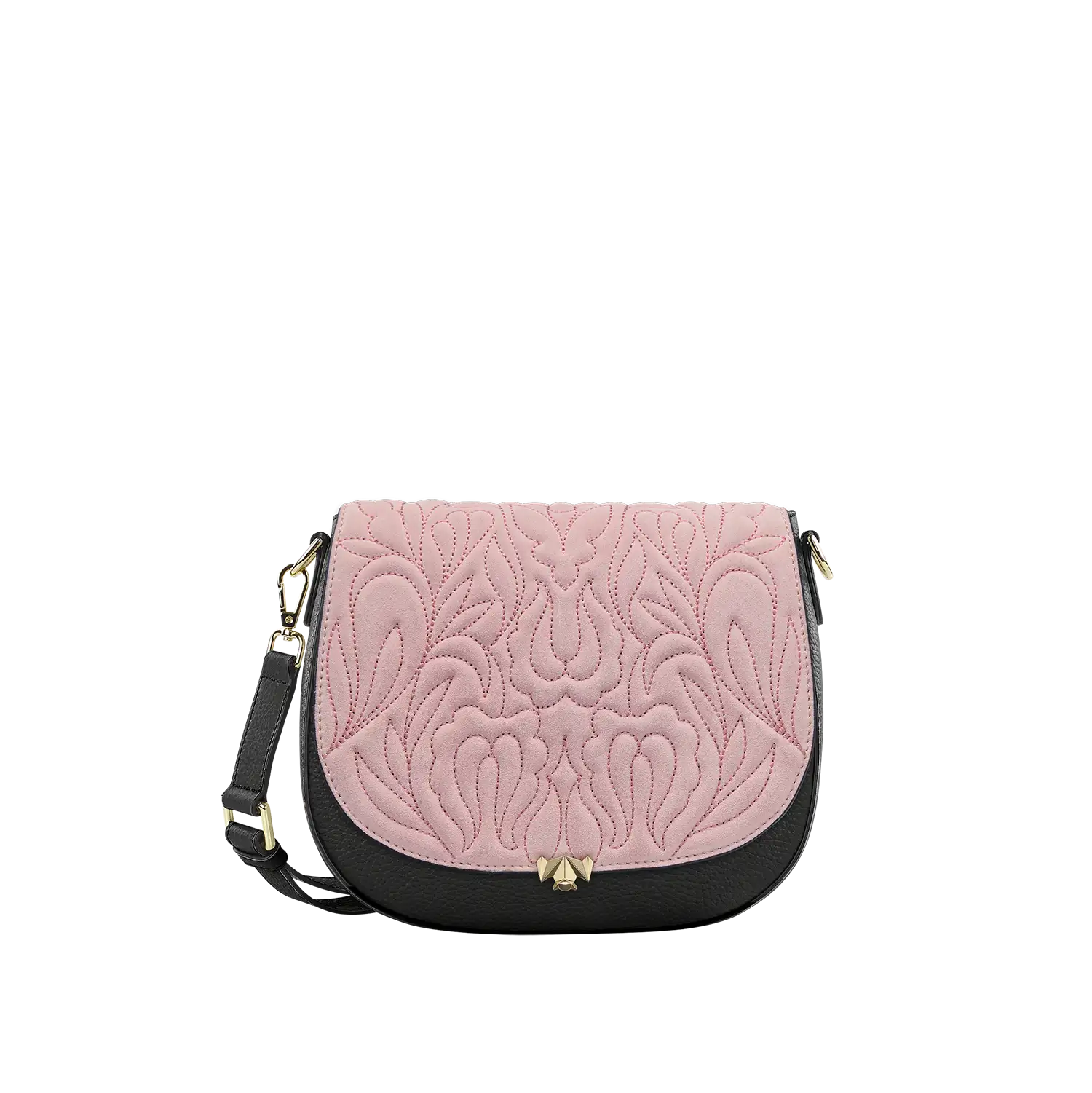Die Wechselklappe besteht aus hochwertigem Veloursleder aus Italien. Die aufwendigen Stickereien sind hanggefertigt und zeigen florale Elemente. Durch die gepolsterte Optik, wirken die Blumen noch schöner und lebendiger. Die Metallic Garne sind Made in Germany und Oeko-tex Standard 100 zertifiziert.