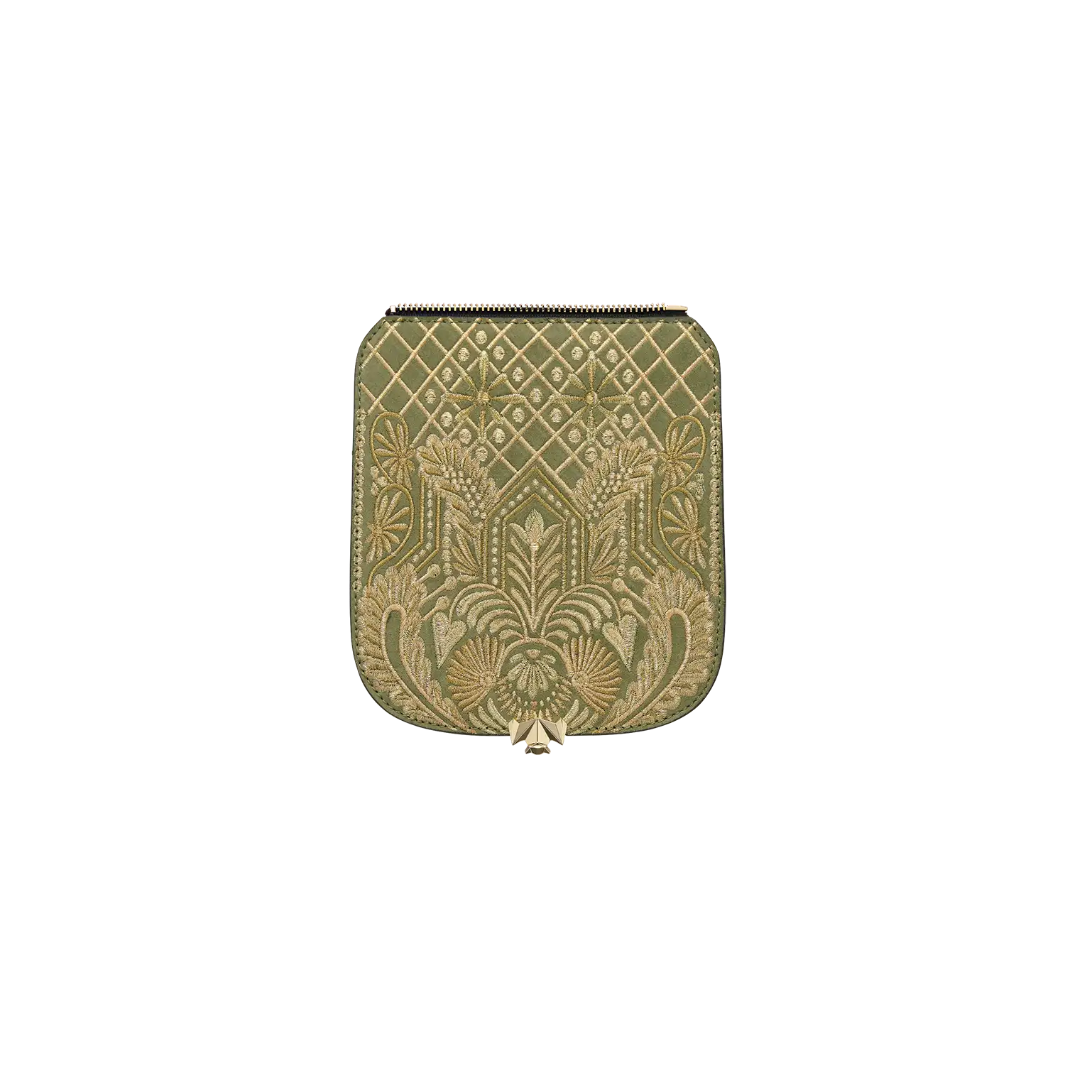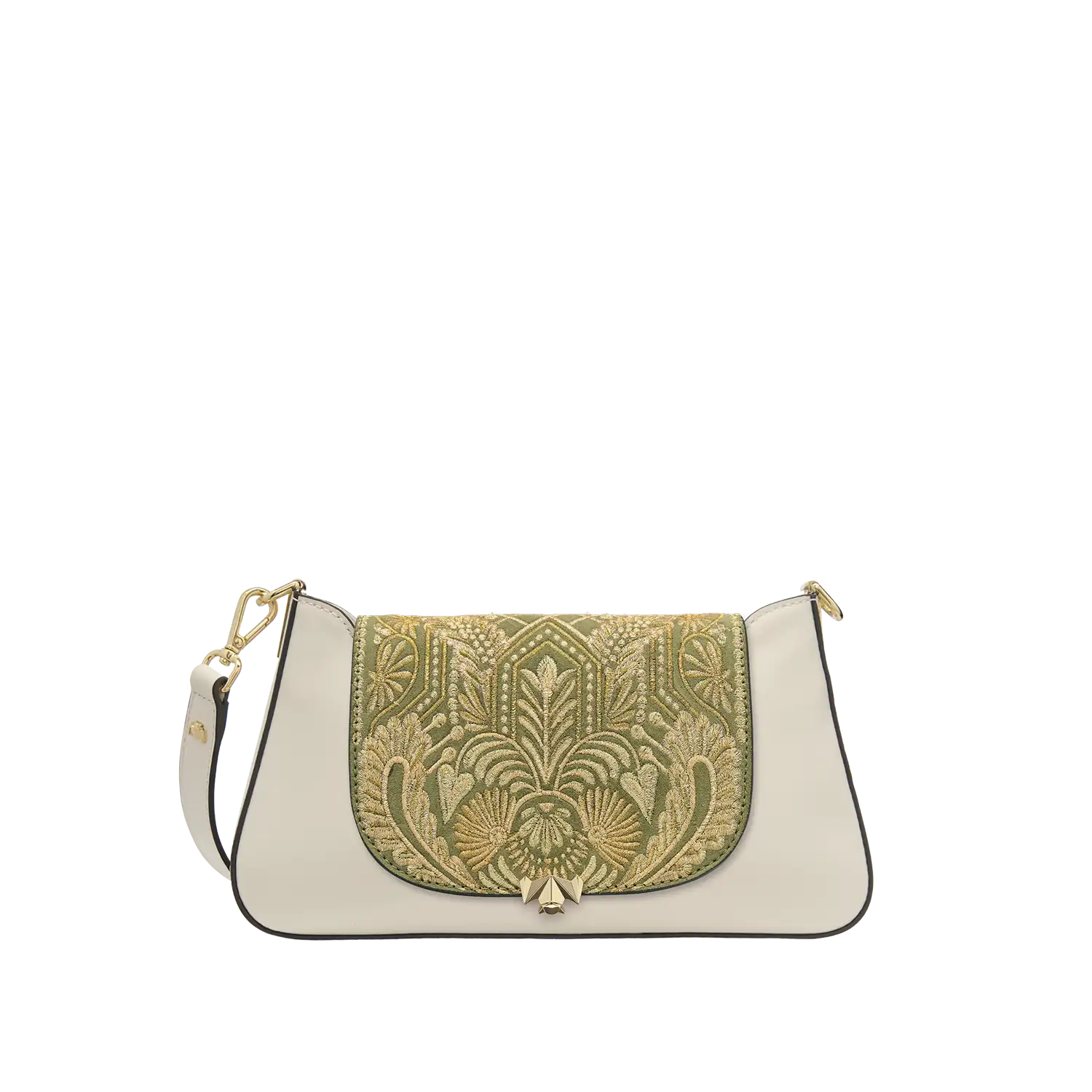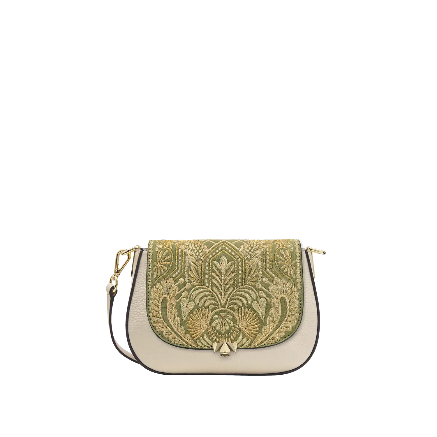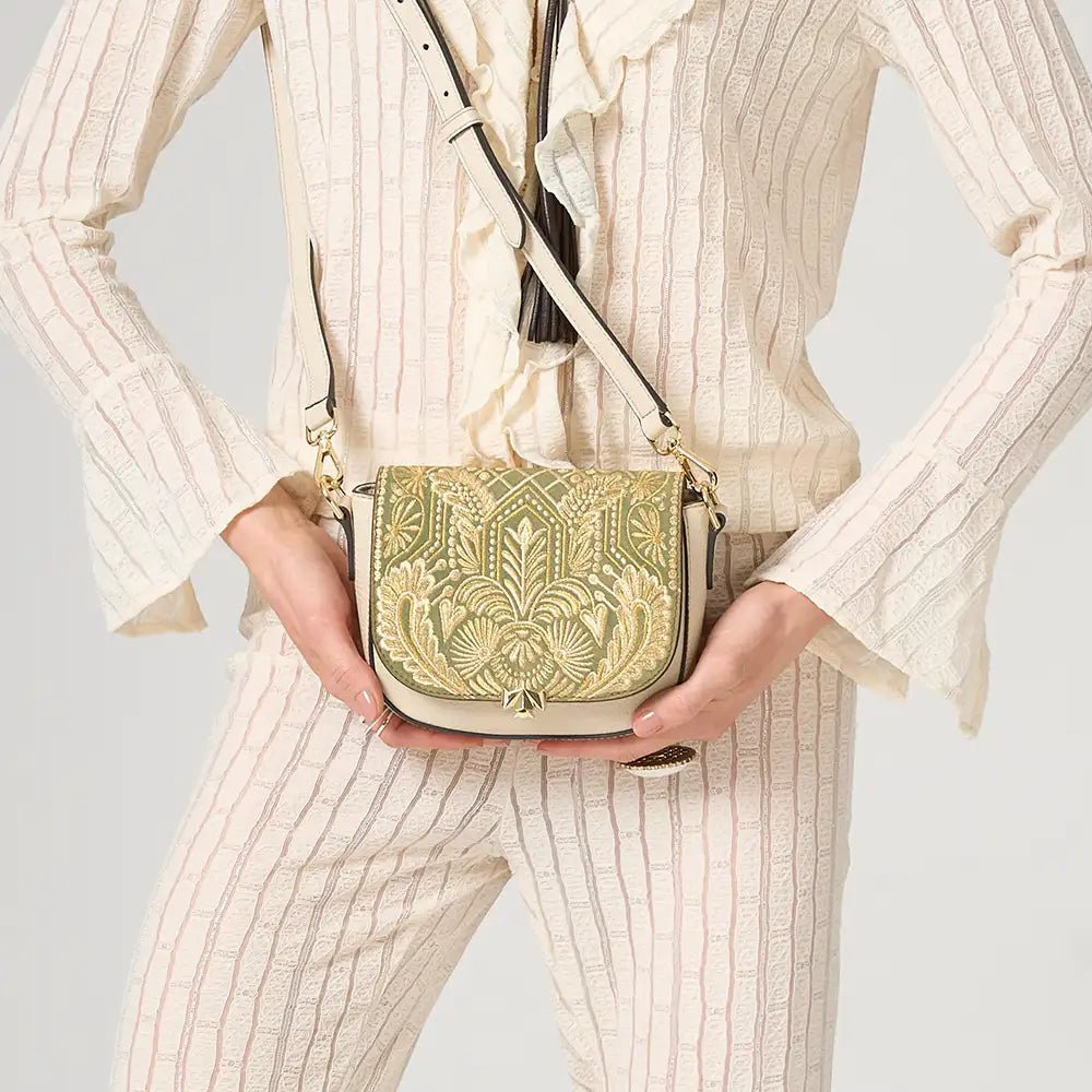 • Die Wechselklappe besteht aus hochwertigem Veloursleder aus Italien. Die aufwendigen Stickereien sind hanggefertigt und zeigen florale Elemente kombiniert mit geometrischen Elementen. Die Metallic Garne sind Made in Germany und Oeko-tex Standard 100 zertifiziert.
