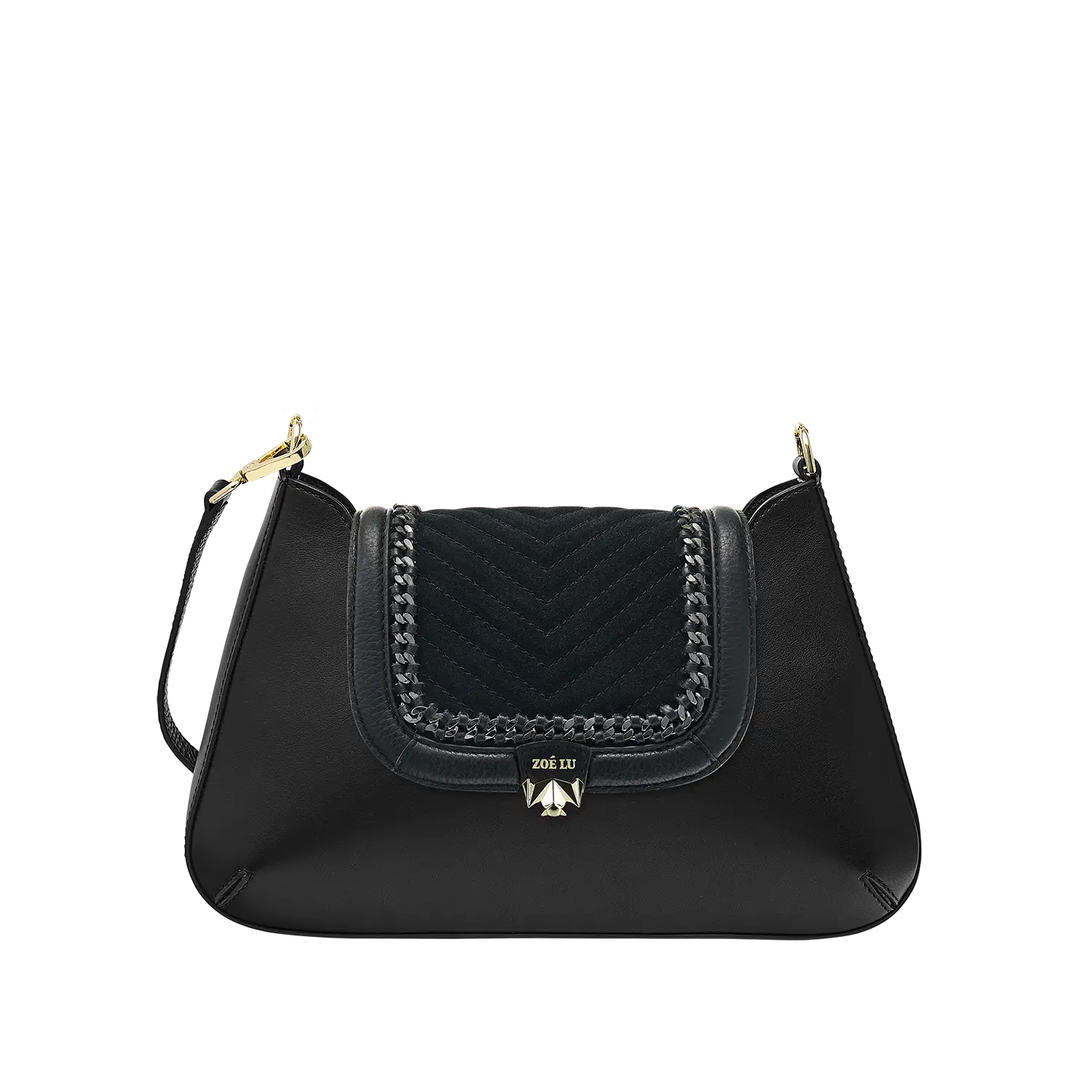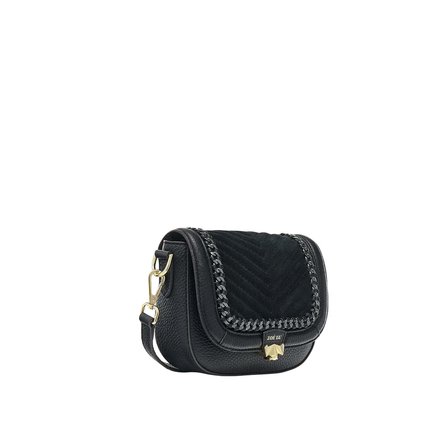 Die aufwändigen Kettendetails in der Wechselklappe Mini Minuit Noir entstehen in Handarbeit und machen diesen Style in Kombination mit Veloursleder im V-Stiching zu einem echten Statement-Piece. Die hellgoldene Metallkette wird in einem Rahmen aus Glattleder eingearbeitet.
